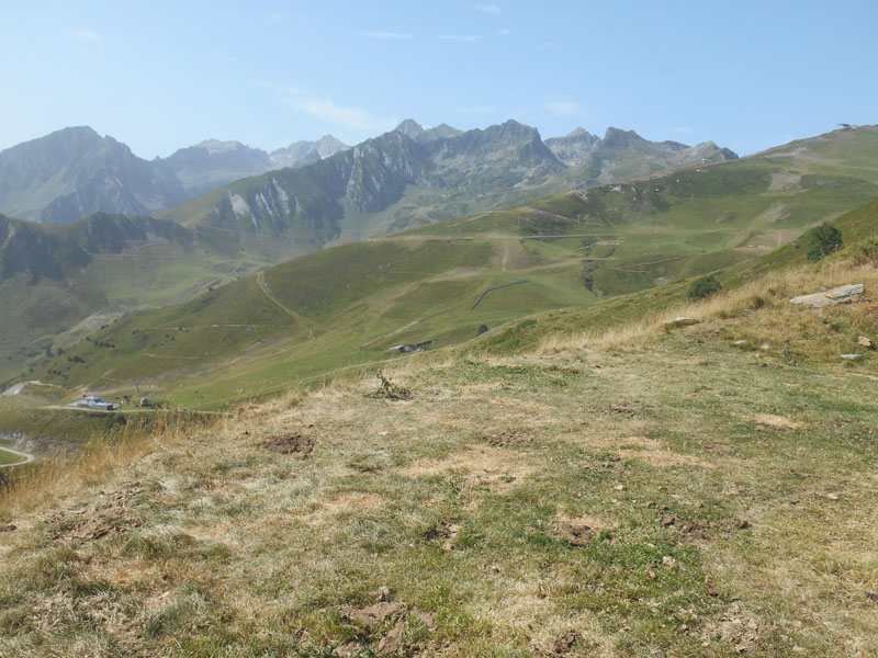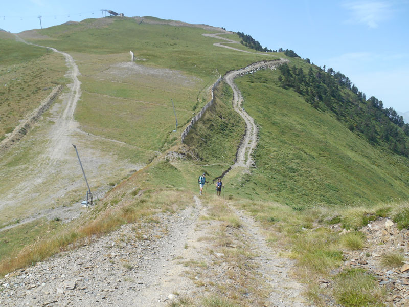 Nous suivons la piste de ski l'hiver qui monte au nord au col de Riou. De larges virages glissent le long des pentes herbeuses. Une petite marmotte se promène sans inquiétude. Nous parvenons au col de Riou à 11 h. Au nord nous observons l'Escalabor, le Pène Nère, le Tuc des Arribans et le pic du Viscos.