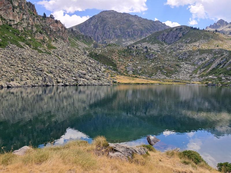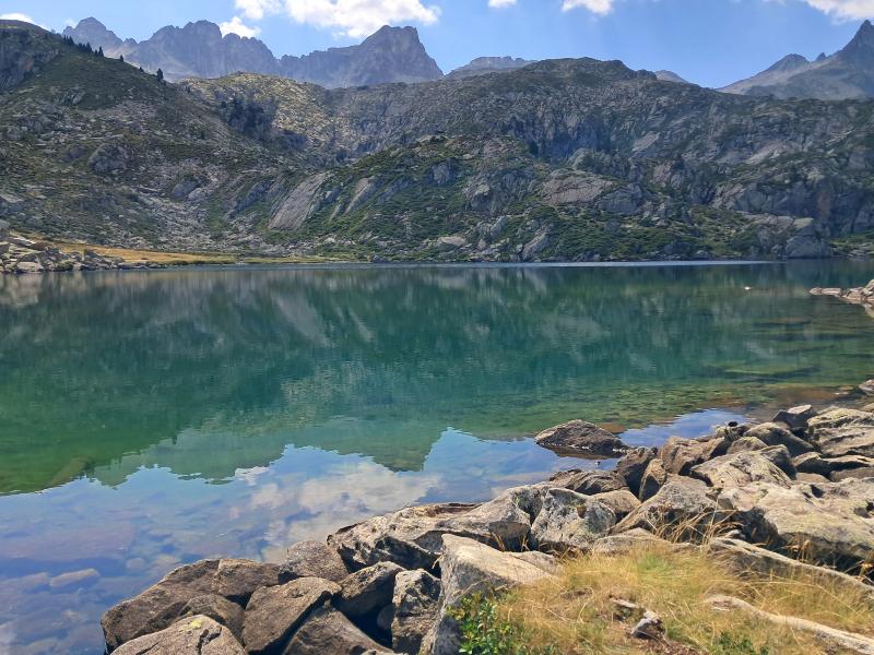 Le grand et splendide lac est posé dans le bassin lacustre de la Glère dans la vallée du Bolou. Il est bordé par les flancs du pic de Lurtet, du pic d'Astazou, de la crête de la Mourèle. Le refuge de la Glère est perché au-dessus à l'ouest. Nous déjeunons à quelques mètres en hauteur. Peu à peu des marcheurs s'agglutinent.