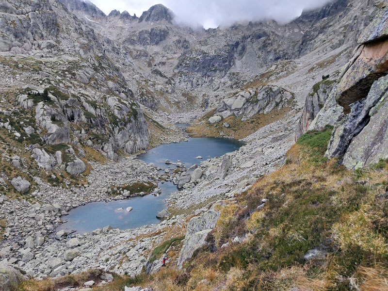 Au loin la Dent de Batbielh montre ses crocs. Canine ou molaire pointue, elle parait inaccessible. Il me faudra du mordant pour l'approcher. À flanc de montagne, par le côté gauche nous parvenons aux lacs de Bartbeilh (2 229 m.). Trois grandes baignoires ou bassins déformés sont coincés dans les rochers et éboulis, dont les eaux bleues et sombres tentent de réfléchir les nuages qui passent.