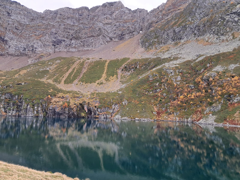 Toujours très raide sur un sentier relativement facile, la progression est régulière et le pas assuré. C'est ainsi que nous arrivons au lac de Peyrelade. La vaste étendue d'eau sombre reflète les crêtes de Caoubère, de Pène Blanque et de Pène Laouade. Le ciel s'éclaircit dévoilant un beau paysage. Après quelques photos nous poursuivons l'itinéraire vers le nord-ouest. Nous suivons une crête qui amène au Cap de Labasset, à 11 h 30.