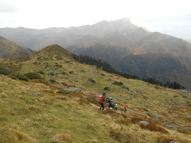 Vers 13 h 10 c'est la descente par la crête nord-ouest. Malgré la forte pente l'allure est rapide. Alors nous parvenons aux ruines des cabanes de Lahus. Peu à peu le cheminement nous ramène sur le sentier de l'aller où le ruisseau de Brouilh est à traverser en plusieurs endroits. Dans le bois de Pouzac les passages boueux sont nombreux. Sur la piste des engins forestiers ont tracés des ornières.