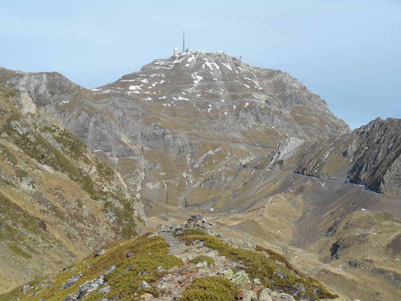 À travers les pentes herbeuses pour éviter les longs virages du sentier, nous montons directement. Le rythme est tranquille. Récupérant le sentier nous progressons toujours vers le nord entre la crête du Tourmalet à l'est et la Bonida à l'ouest. Le pic du Midi de Bigorre dresse sa grande antenne et ses bâtiments perchés au sommet.