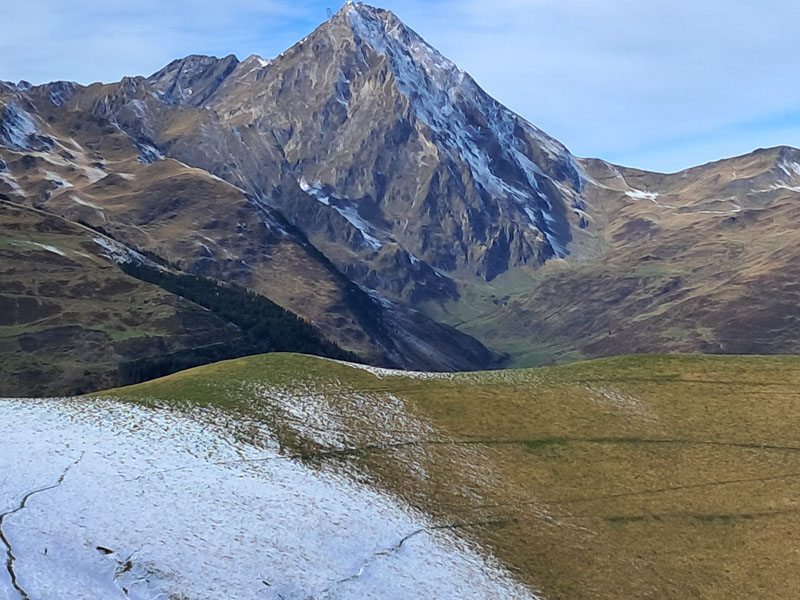 Les 2 groupes rassemblés nous poursuivons l'ascension pour le Tuhou Gran en marchant dans la neige. La montée de ce sommet est franchie en quarante minutes. Nous déjeunons en contre-bas au sud, protégés d'un vent léger et dans une ambiance de fête.
