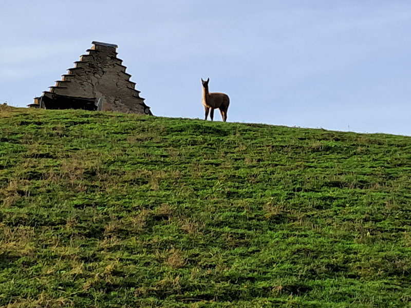 La piste est atteinte, puis c'est le sentier qui tombe sur la petite route. L'allure tranquille est propice aux discussions par petits groupes et avec Florence V. et Philippe sous le regard intrigué d'un lama, dans un lieu, une zone où ce camélidé n'est pas attendu. Est-ce Lama-zone ? L'arrivée à La Séoube est à 16 h 40. Nous allons déguster boissons et gâteaux dans un bar de Bagnères.