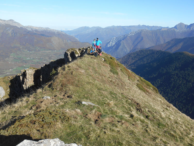 Nous descendons. La suite du cheminement remonte à l'est pour parvenir au col d'Escourets. Ensuite nous suivons la crête au nord pour l'ascension qui devient légèrement aérienne. Sans bricoler nous atteignons le pic Bricoutou à 11 h 45. Une arête au nord, longue de plusieurs mètres porte la vue sur Lescun, les Orgues de Camplong. À l'est le pic de Labigouer, le Pène d'Udapet, le Sesque, la Table de Souperet, le Vizaurin, le Lariste, les Aiguilles d'Ansabère, le Billare, etc.