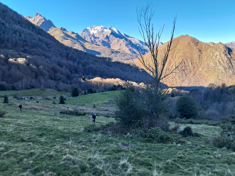 Nous partons dans les Hautes-Pyrénées à Estaing. Le ciel est bleu. Le soleil est caché par les cimes. La température est fraîche : 7 degrés. 9 h, nous descendons depuis la mairie au nord sur la petite route D103, jusqu'au carrefour de la piste pour remonter à l'est dans le bois et le talweg du ruisseau d'Arribancié et de Banciole. Le cheminement continue au nord-est passant près des granges de Cazau. Sur le parcours des ruisseaux sont à traverser. Les pierres sont glissantes, un bain de pieds est assuré...