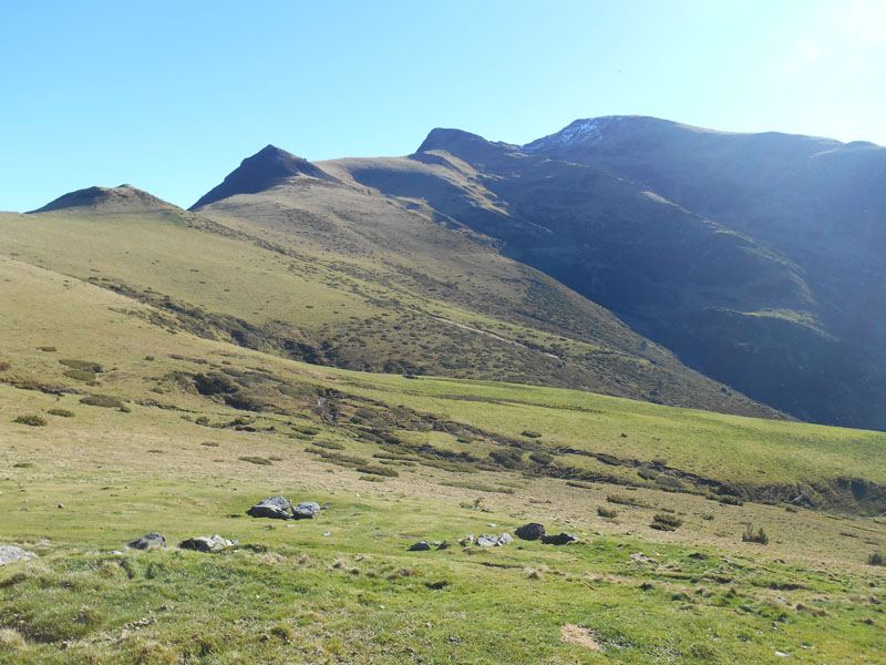 Sortis du bois nous progressons dans de vastes vallons herbeux. Le paysage se dévoile, au sud, sud-ouest surgit le pic du Midi d'Arrens, la crête des Taillades Blanque et les Gabizos, le Balaïtous, le Monné de Cauterêts plus à l'est, et d'autres encore.