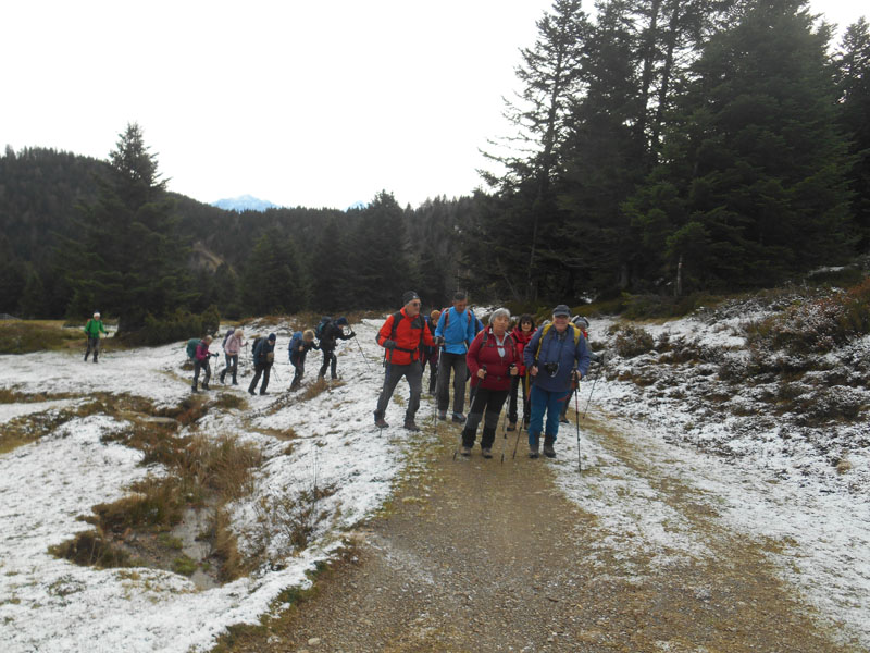 Au cours de la randonnée les 2 groupes sont mélangés. Du col de Couraduque nous montons par une piste au nord qui s'enfonce dans la forêt de sapins et de hêtres. Le soleil brille dans un beau ciel bleu. La température est fraîche : 4 degrés, puis va s'élever dans la journée. Le rythme est paisible, les conversations occupent autant que la contemplation des paysages.