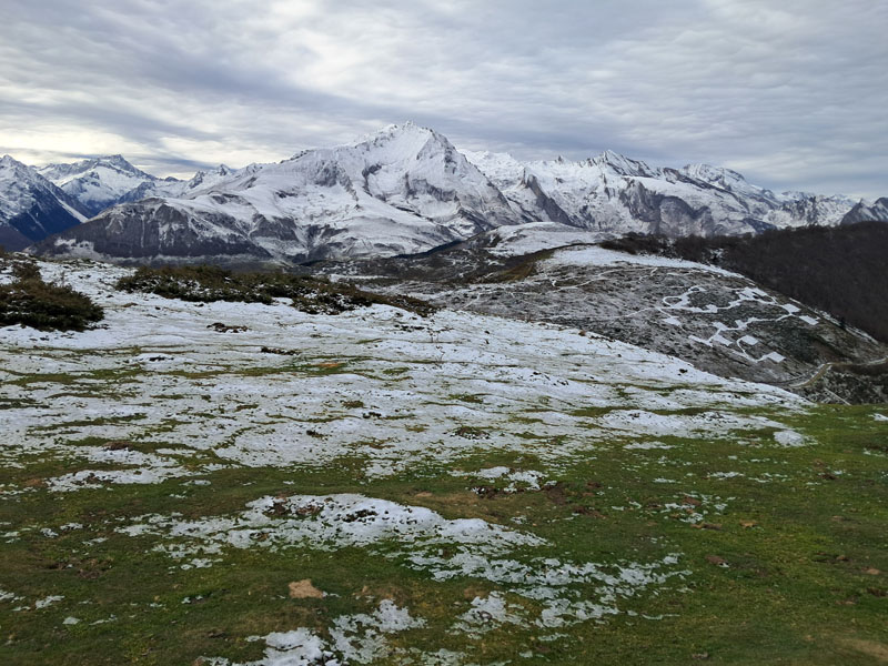 La piste tourne à l'ouest, l'Abédiet, face au majestueux pic de Bazes et au Navaillo. Le chemin repart au sud et traverse le col de La Serre (1458 m.). A nouveau il vire à l'ouest franchissant le ruisseau de Taillade et effectue plusieurs virages s'approchant de la fontaine de Marioulète. Alors par un sentier saupoudré de neige il amène au col de Bazes (1509 m.).