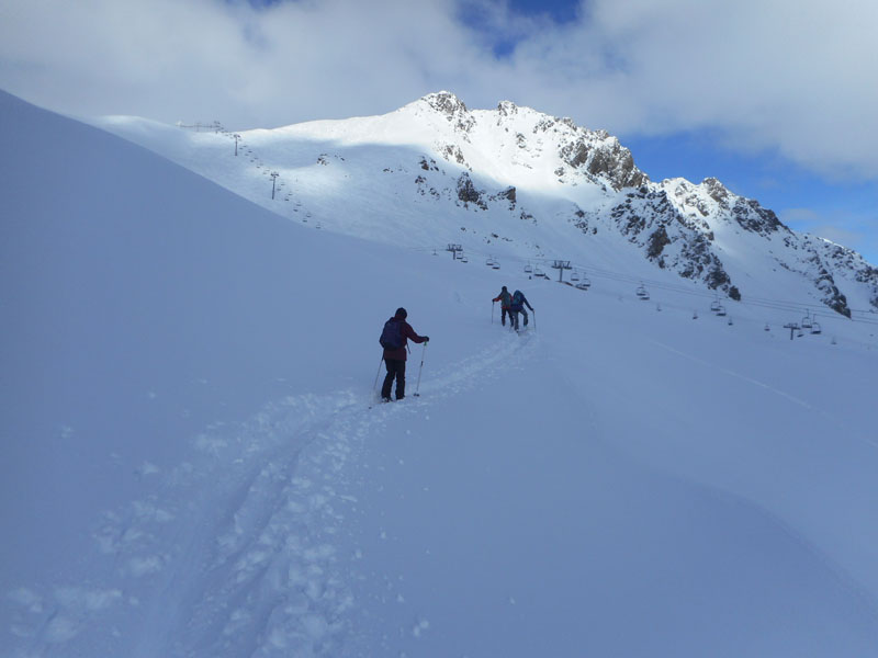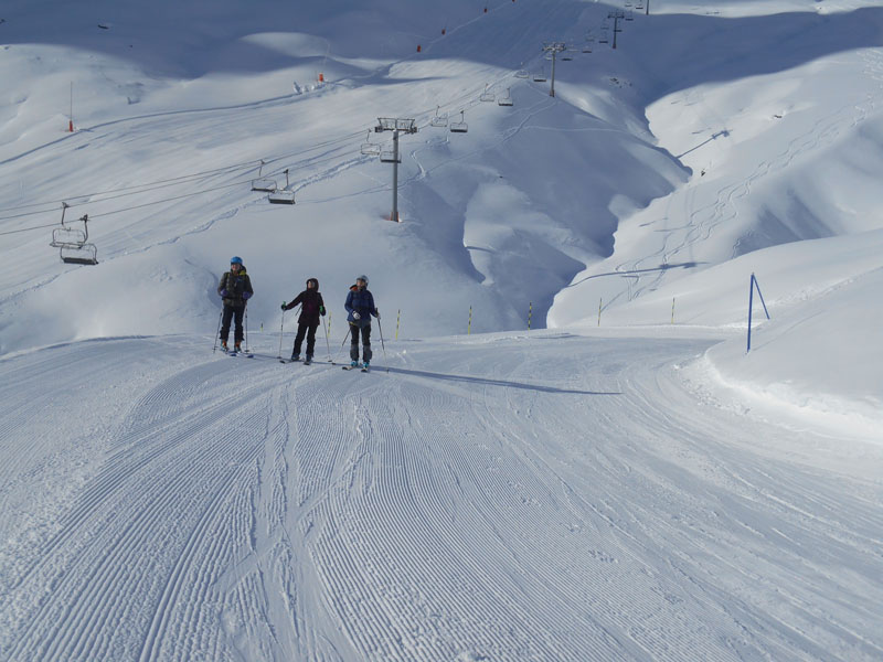 Après les bâtiments hôtellerie fermée, nous montons sur une piste au nord. Les parties raides ne sont pas encore travaillées. Nous suivons la crête proche de Coume L'Ayse, avec la vue sur la Bonida. Un groupe de six skieurs avance devant nous. Nous les rattrapons et reconnaissons des amis, Edmond et Éliane et d'autres du CAF de Tarbes.