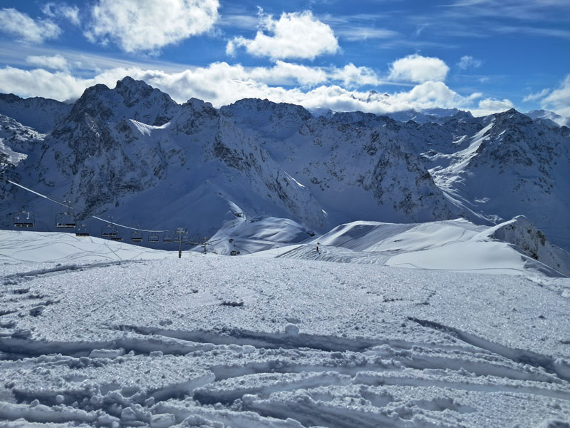 La piste face sud ensoleillée monte au nord-ouest. Les dameuses préparent les pistes pour l'ouverture de la station de ski. Des canons à neige sont en fonction. Le pas est régulier et tranquille. Une déviation permet de passer au-dessus de la piste travaillée. Ainsi nous arrivons au col du Tourmalet. (2115 m.). La vue est magnifique sur les cimes blanches au sud : pic des Quatre Termes, Soum du Cot de L'Espade ou pic Allemand, pic de Campana, etc.