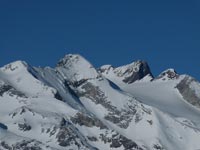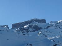 Nous descendons une belle pente dans une neige mixte : glacée et poudreuse par endroit. Il nous faut remettre les peaux pour gravir, en étape, le sommet et poser ensuite les couteaux, pour la pente finale de la Montagnette. Nous devons nous arrêter à quelques mètres du sommet la glace et le rocher rendant périlleux son ascension.