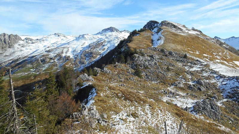 Je descends, au nord, par un couloir raide et enneigé. Je dépasse le Pas det Oeilher (1609 m) et me dirige vers les cabanes de Bésur. Le sentier enneigé est très glissant. Par précaution je grimpe vers la crête. Je domine les cabanes de Bézur et parvient au Soumets, à 12 h 20. Je scrute les environs, admire les cimes et reviens en arrière.