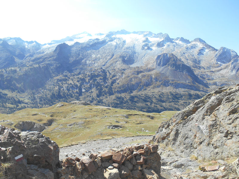 Une autre montée raide est à flanc de parois. Les virages serrés dominent l'abîme. Le passage qui nous conduit au Port de Vénasque est sur de la neige gelée. La vue est magnifique. L'Aneto, enneigé, s'élève au-dessus de toutes les cimes et déchire le ciel azuré. Maladeta, Posets, par un ensemble de crêtes s'enfuient à l 'ouest retrouvant le cirque d'Espingo . A l'est paraît Aiguestortes, le cirque de Colomers et ses sommets à 3000 m.. Devant nous le pic de Sauvegarde et le pic de la Mine crèvent l'immensité bleue.