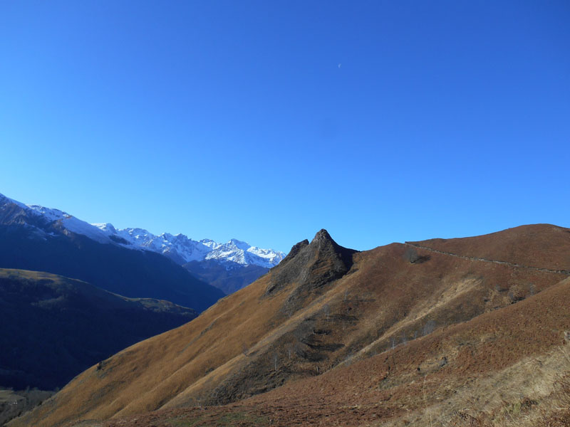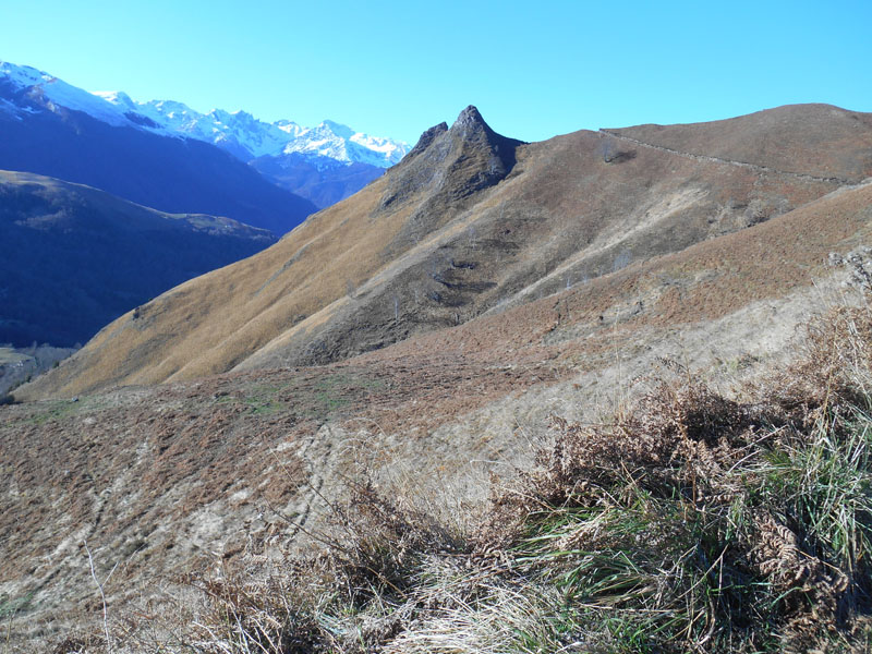 C'est un peu tard pour gravir la crête qui mène au pic de Coos. Nous revenons vers le sud et montons sur la crête Gangue La Baraille. Au pied du bois, dans un creux, nous nous installons et déjeunons (12 h 45). La chaîne des Pyrénées diffuse ses sommets infinis, du pic du Midi de Bigorre, Montaigu, Sanctus, Sarrière, Pène Medaa et autres plus au nord-ouest. Des vautours dansent le bal des airs.