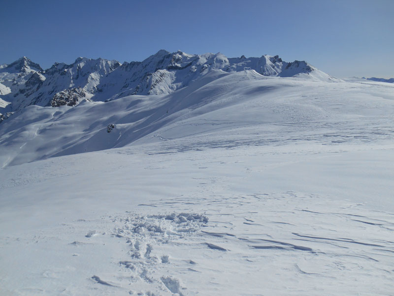 Après de nombreuses conversions, nous parvenons au col de Soum de Pombie, face au pic du Midi d'Ossau. Il est trop tard pour descendre et remonter aux crêtes de Moustardé. Nous suivons, alors la crête ouest, vers le massif de Peyreget et nous parvenons sur le point le plus élevé à 2227 m.. Il est midi. Nous déjeunons exposés au vent froid, mais face aux cimes sud et ouest, avec les pics d'Anéou, Anayet, Canaourouye, La Gradillère, etc.