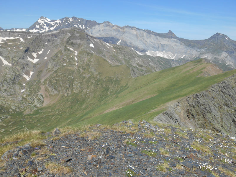 Nous poursuivons sur la crête et montons au pic Forqueta, vers 11 h 40. A l'ouest s'exposent le mur de Barroude, les pics Gerbat, La Géla, Soum des Salettes, Estaragne, Campbiel, pic Méchant, Néouvielle, etc. Toujours longeant la crête de Port Vieux, nous parvenons au pic des Aiguillettes, à 12 h. Nos amis sont toujours sur le pic de Marioules, alors nous revenons en arrière. Mais ils arrivent. En attendant le groupe, nous scrutons les cimes Est de la vallée du Rioumajou, le Batoua, le Lustou, le pic d'Aret et d'autres encore. Nos amis arrivés, nous déjeunons, sous la chaleur, caressés par un vent léger et contemplant l'immense paysage.