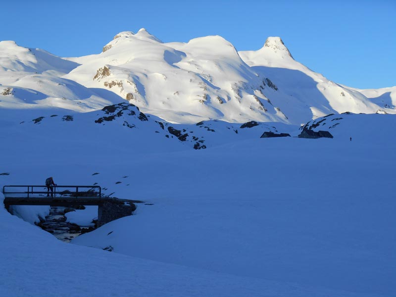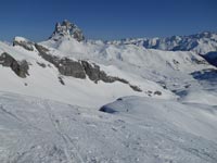 Le plongeon dans la pente est impressionnant, d'abord en dérapage sur la glace, puis en succession de virages serrés à couper les jambes. Nous sommes soulagés d'arriver en bas. Nous remettons les peaux pour monter au col. La suite est une descente dans une neige de rêve. Nous déambulons entre les bosses et les creux, évitant les ravins, dans une danse acrobatique, digne des jeux olympiques de Shotsi.