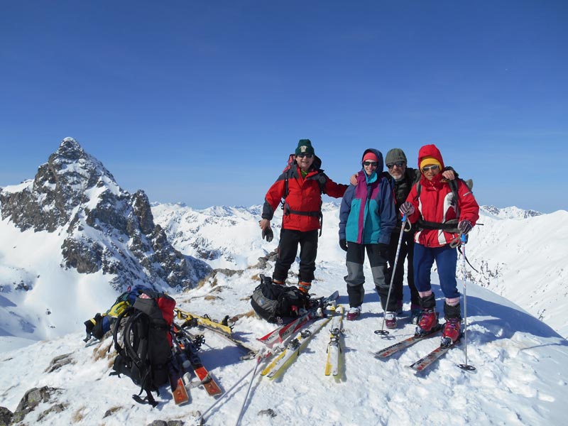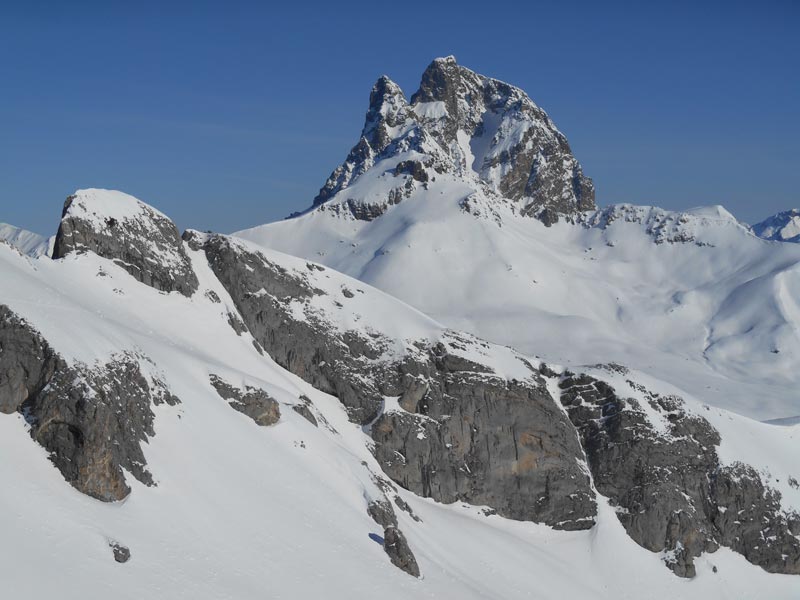 Pour aborder les pentes redressées, nous posons les couteaux sous les skis et nous nous élevons entre le Pène de Mauhourat qui s'accroche au pic d'Anéou et le col d'Anéou. À 11 h nous atteignons le sommet de Cuyalaret. Le panorama est grandiose, du pic du Midi d'Ossau, au Palas, Balaïtous, de l'Anayet au pic d'Anie et cimes de la vallée d'Aspe.
