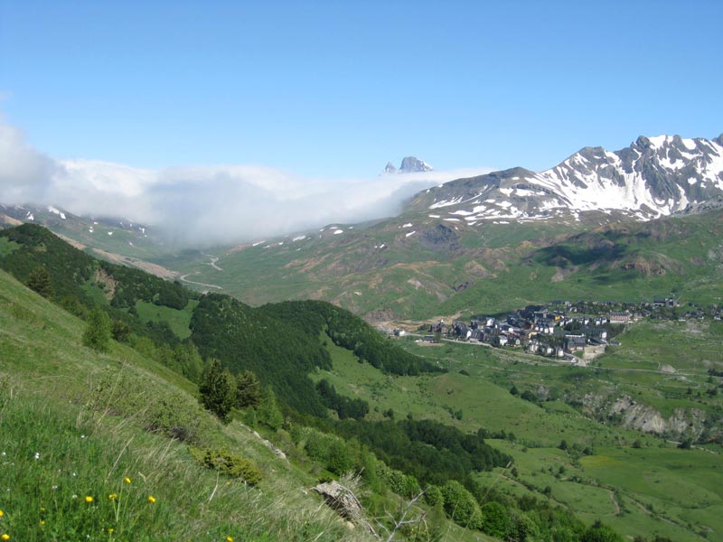 Le sentier part vers un petit bois, puis s'élève dans la nature fleurie, près d'une haute cheminée, que nous dépassons. Une montée progressive nous amène sur le col de Pazino, très venté. Le cheminement se poursuit, au sud, par une crête. Nous atteignons le pic de Pazino à 11h40. La vue panoramique nous présente le lac de Lanuza, le village de Sallent de Gallego et les massifs vers le pic de Musales. De l'Est au sud, les cimes de la Telera et de Piedraffita bouchent l'horizon. Le lac et barrage d'Escarra baignent les pieds du large massif de la Sierra de Condiana.