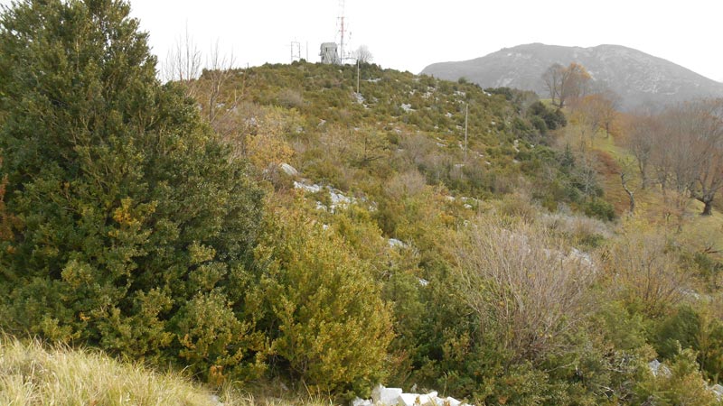 Nous suivons la crête, en passant devant le Rocher Mystérieux. Puis nous parvenons sur un autre sommet (719 m.), où se trouve l'ancienne gare du téléphérique, en ruine. Une antenne relais s'accroche au sommet.Nous redescendons en effectuant une petite boucle et arrivons à 11 h 30.