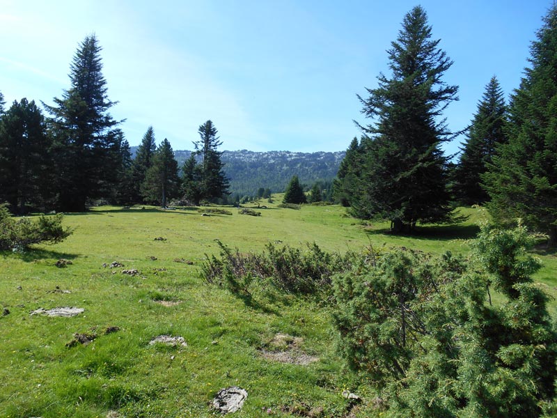 Nous débouchons sur un plateau vallonné parsemé de jolis sapins et d'arbustes.De vastes prairies à l'herbe haute, décorées de fleurs font le régal de troupeaux de chevaux et de vaches. Au sud, les Orgues de Camplong ferment l'horizon.