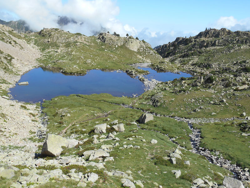 Cet ensemble de lacs est une merveille. Chacun a sa forme, ses couleurs et repose dans des reliefs différents. Le cheminement imprécis traverse le Tuhou Arrédoun du Bas et nous conduit au petit lac de L'I enfoncé dans une cuvette rocheuse. Par la suite nous nous dirigeons vers le nord, par le Cap de Gréziolles. le long du ruisseau du Limaçon. Mais le ciel se couvre d'épais nuages.