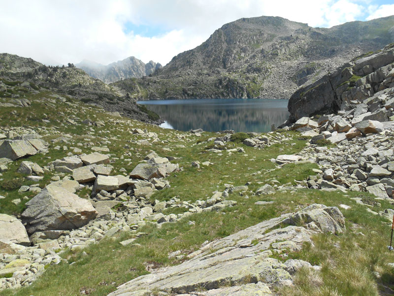 Nous longeons la masse d'eau par l'ouest, pour rejoindre le lac de Gréziolles, côté est, autre immense surface d'eau et nous marquons une courte pause. Le passage des blocs rocheux, par la suite, suit une bande de terre et rochers plats permettant de traverser la Laquette de Grésiolles, autre joli lac dont les eaux calmes s'exposent aux rayons du soleil. Puis c'est une grimpée raide qui nous entraîne au pied du refuge de Campana de Cloutou, à 11 h.