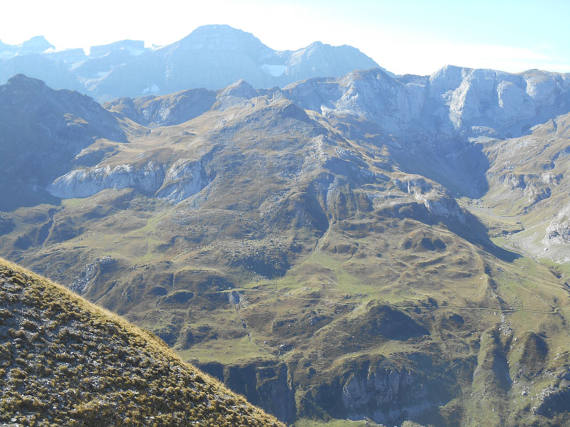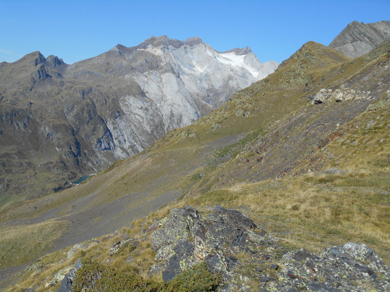 Nous arrivons au col d'Aspé ou de Pla Communau (2284 m.), vers 11 h.. La vue sur le cirque de Gavarnie est époustouflante, du Marboré, Brêche de Roland, Taillon, etc. Nous grimpons au Soum de Labassa, atteint à 11 h 30. Le spectacle continue : pic du Midi de Bigorre, Piméné, du nord à l'est. Une petite descente, puis une nouvelle montée et nous atteignons les trois sommets des Meyts, ceci à midi. Le Vignemale et son petit glacier semble à porté. Les Tapou ont du mal à se distinguer, entourés des pics de Lourdes, Gabiét, Soum des Especières, qui prolongent ce magnifique panorama.