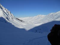 Cécile se jette dans la pente. Je la suis. Nous enchaînons les conversions puis les virages et Philippe s'accroche derrière nous. La neige est très difficile. Les jambes font effet de ressorts. Isabelle et Maylis nous ont rattrapés. Nous apprécions une partie de glisse dans le vallon, où nous pouvons serrer et enchaîner les virages.