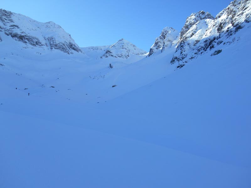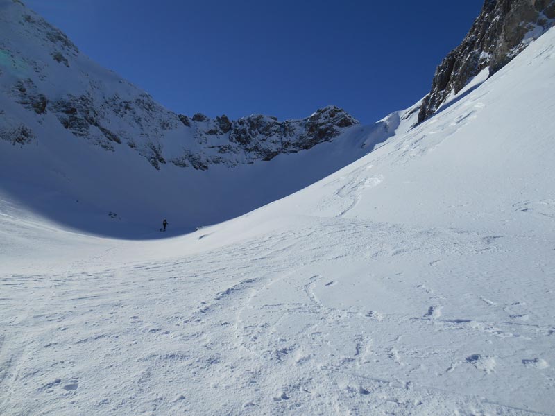 Nous retirons les peaux pour descendre vers le lac d'Isaby entièrement recouvert de neige. Ensuite nous remettons les peaux et les couteaux, pour nous diriger vers la Petite Estibère. Dans le vallon ensoleillé, nous marquons une pause ravitaillement, alors que les cimes découpent leurs lignes stylisées dans le ciel azuré. Pendant que Maylis et Isabelle filent devant, nous abordons le couloir très raide, croûté et gelé. Nous multiplions les conversions. Soudain mon ski droit se détache sur une plaque gelée. Je manque de peu de chuter. Alors que Maylis et Isabelle sont au col de Léviste, nous préférons nous arrêter là. La descente s'annonce périlleuse.