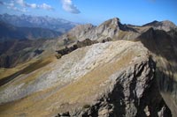 Nous filons sur la crête nord, laissant, à gauche, le sentier de la crête Les Trois Soeurs. Par un rocher haut de quelques mètres, où l'utilisation des mains s'avère nécessaire, nous atteignons le pic de Gaziès, à 13 h 10. Le panorama s'agrandit, rajoutant le pic de Sesques et de nouveaux sommets, alors que vers le bas, les lacs d'Er et d'Aule, forment des larmes bleutées dans le vert du paysage. Le repas s'apprécie d'autant plus dans ce cadre remarquable.