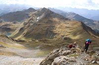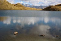 Au départ la descente légèrement aérienne peu impressionner, par manque d'habitude. Du col, nous fonçons vers le lac d'Aule. La vaste étendue d'eau semble absorber le ciel, ses nuages et ses couleurs, dans laquelle s'éclairent et miroitent les cimes lointaines.