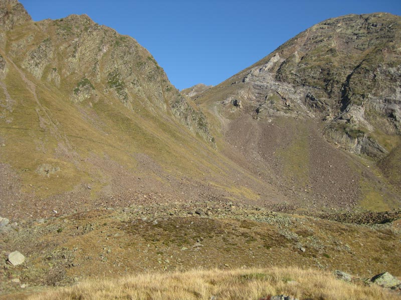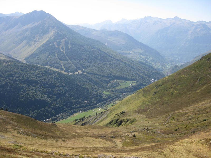 Nous déjeunons et repartons, pour une boucle, coté ouest. La descente s’effectue par des pentes herbeuses très raides, à certains endroits. Nous retrouvons la piste, que nous quittons aussitôt, en coupant par des pentes, que nous dévalons rapidement. Accroché à la bruyère, je parviens, après un exercice d’équilibriste, à retomber sur le sentier, tandis que Frédéric a préféré prendre un détour moins exposé. Nous arrivons en bord de route à 15h20. Le retour s’effectue sous la chaleur (30 degrés), dans la vallée.