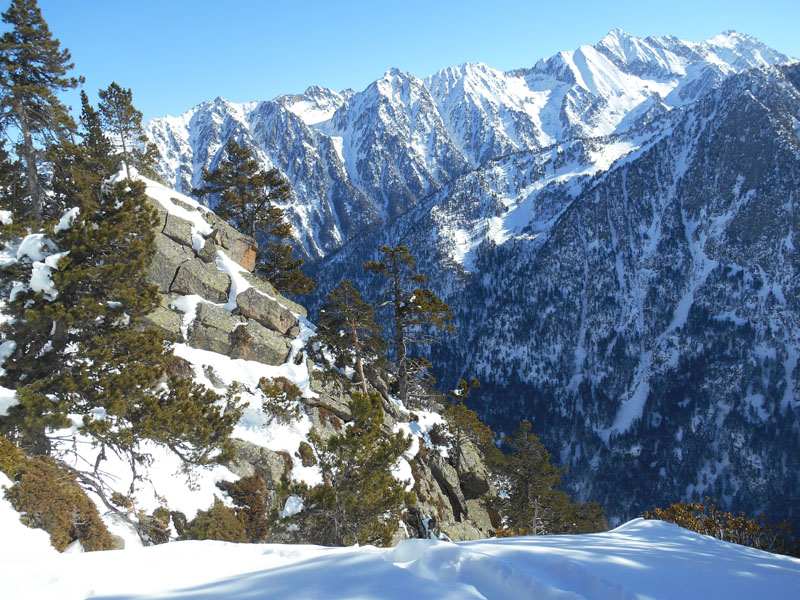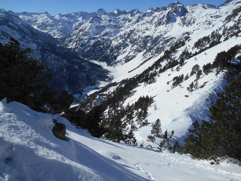 Il est 10 h 20, par une température de -8 degrés, nous montons skis aux pieds, dans le vallon ouest, plongé dans l'ombre, en direction du Plaa des Artigues. Les cimes blanches se détachent dans un fond de ciel azuré. Les rayons du soleil percutent les sommets sans encore nous atteindre.