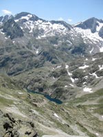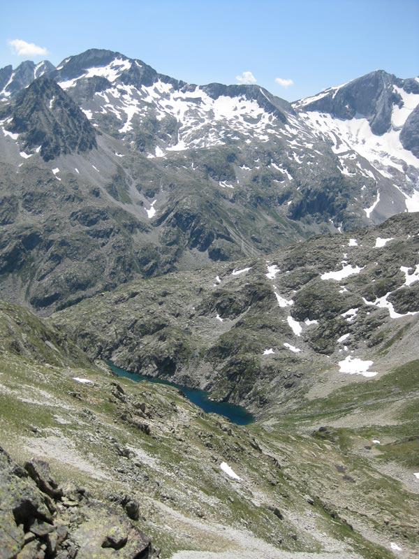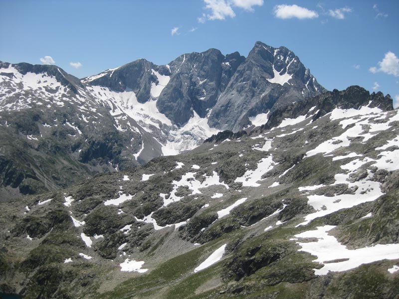 La vue est époustouflante. La face nord du Vignemale surgit devant nos yeux ébahis. Hélas ! Le glacier du Clot de la Hount est dans un triste état. Plus à l’ouest le pic du Chabarrou domine les cimes, comme le Moun Né, au nord et le pic Péguère. Le lac du Chabarrou reste au fond du vallon des Oulettes.