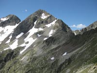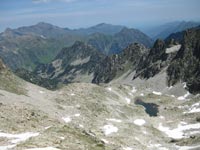 A nouveau le sentier devient très raide et nous devons repérer les cairns parmi les rochers et les pierres. Le passage pour effectuer la boucle par la Brèche du Peyrot (2650 m.) présente un long couloir abrupt en neige glacée. Sans crampons, ni piolet, nous ne pouvons tenter l’ascension. Nous tentons, donc, l’ascension de la crête de Pouey Trénous à Chabarrou. Nous parvenons sur une pointe à 2683 m.