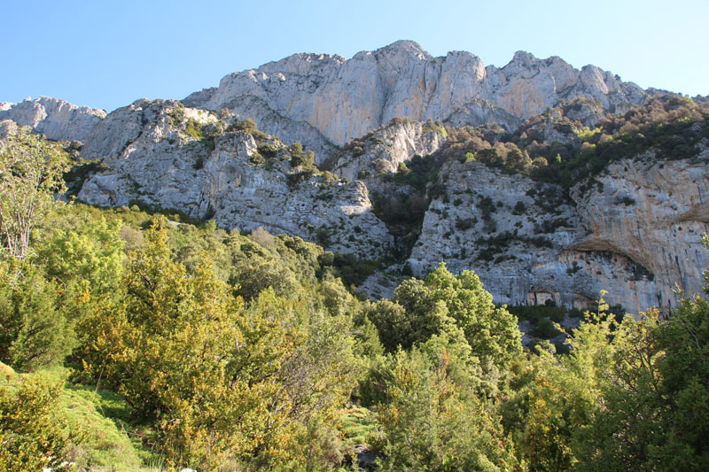 Le cheminement demande l'observation des cairns et les divers sentiers qui se croisent. Passant sous les barres rocheuses, nous parvenons dans la garrigue. La chaleur est étouffante. Quelques buis suffisamment hauts nous donnent un peu d'ombre, mais le retour nous parait interminable dans cette fournaise. Nous atteignons le parking à 18 h, soulagés, nous allons nous mettre au frais.