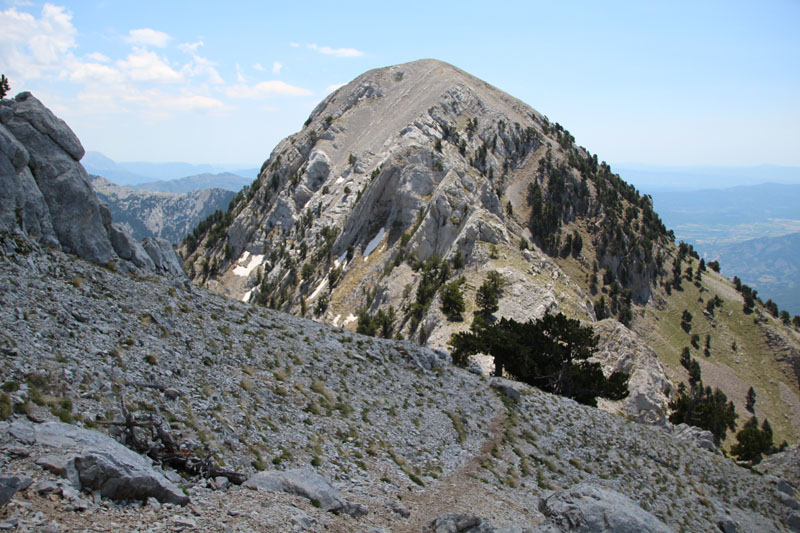 Le sentier s'échappe à travers un pierrier qui tombe dans le vide. Puis c'est un autre pierrier, dans un couloir vertical très pentu, qui se présente. La montée du pierrier sous la chaleur est particulièrement éprouvante. Parvenus à 2220 m, près du sommet, nous nous arrêtons, vers 13 h, suite à un coup de chaud !