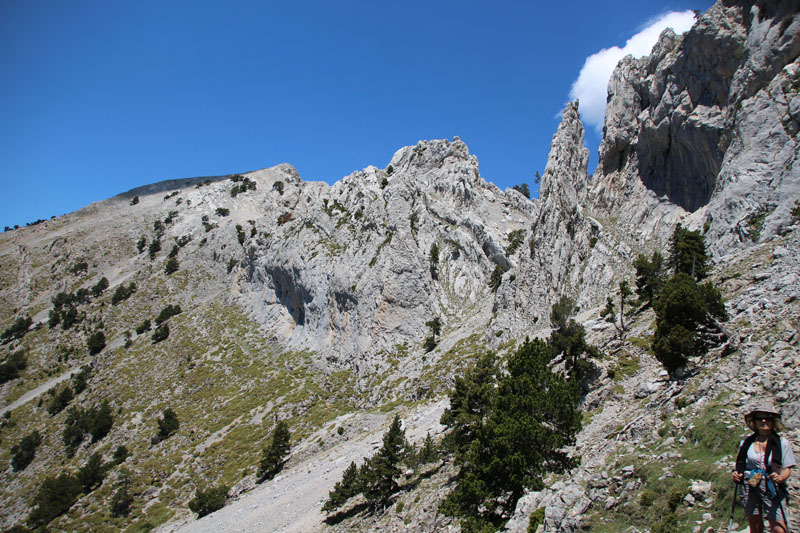 9 h 15, nous montons, avec Andrée dans le bois et la garrigue. Le soleil brille dans un magnifique ciel bleu et la chaleur envahie la montagne. Le sentier passe par un collet Puyelo Arriba (1280 m.) et s'élève en pente douce en direction du sud-ouest. Une heure plus tard nous sortons de la garrigue et le cheminement s'effectue à travers les buis et les Arizonas (coussins de belle-mère), jusqu'à une petite barre rocheuse (1745 m).