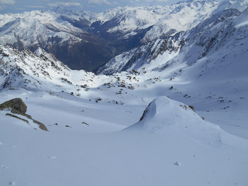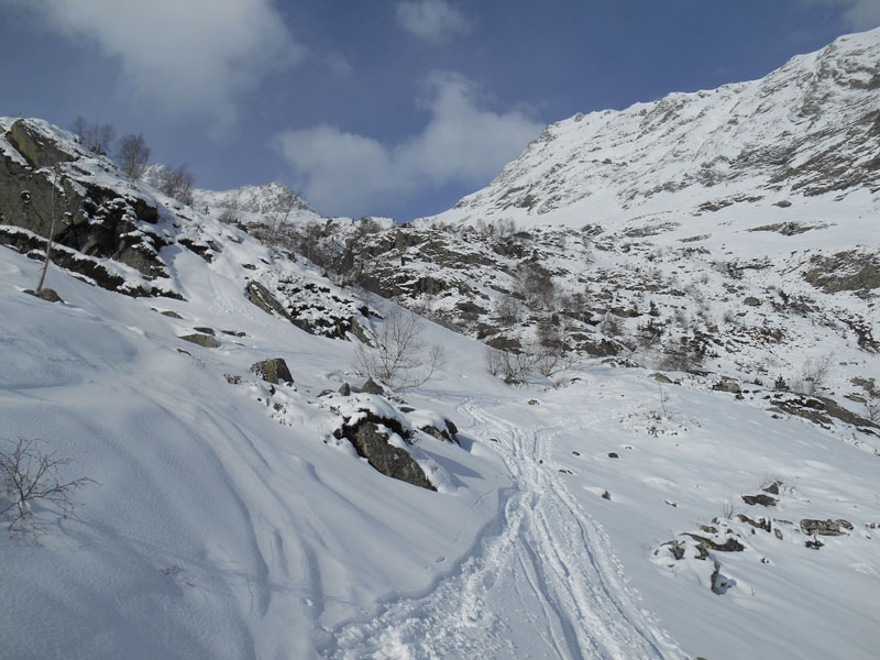 Dans le vallon les pentes sont plus abordables et entraînent des traversées.