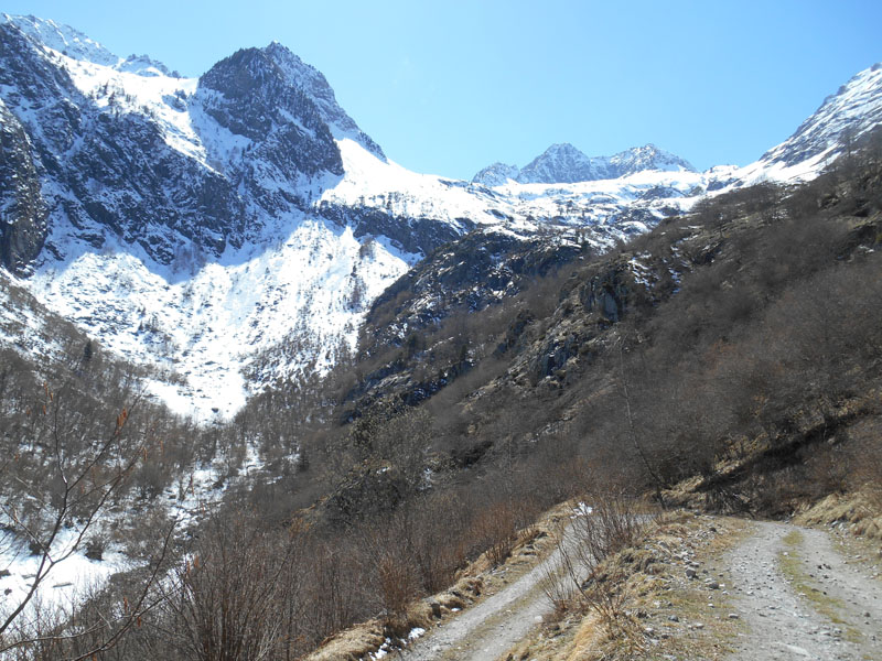Nous remontons le long de la piste forestière skis aux pieds, à 9 h 15. La température est douce. Le soleil éclaire les cimes enneigées et argentées. La traversée de ruisseaux nous contraint à retirer les skis. Nous débouchons sur un vallon baigné d'une blancheur scintillante. La trace est à faire et c'est souvent Maylis qui s'y atèle, tout en étant relayée par nous tous. Jean-Pierre passe devant dans les fortes pentes entre la crête de Lats et le Soum d'Eres Blanques. Puis c'est Philippe qui prend la tête. C'est épuisant car la neige fondante oblige à soulever des paquets enneigés et à mon tour je remplace mes camarades. Isabelle souffre des pieds et reste en arrière.