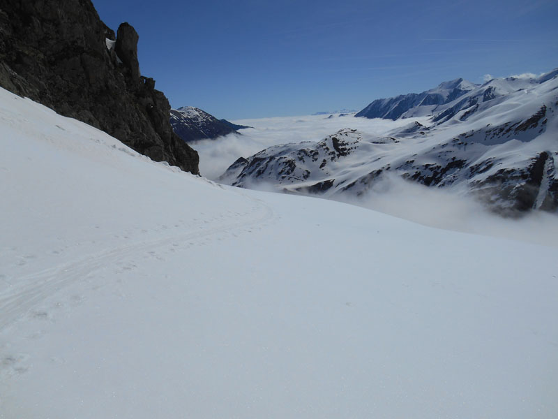 Nous plongeons dans la pente raide. La neige est excellente. Nous jouons à dessiner des virages, comme des arabesques et à inscrire nos empreintes skis sur l'immense banderole blanche posée sur le relief. Passant sous la barre rocheuse, nous poursuivons vers le nord. La mer de nuages s'est retirée comme une marée basse.