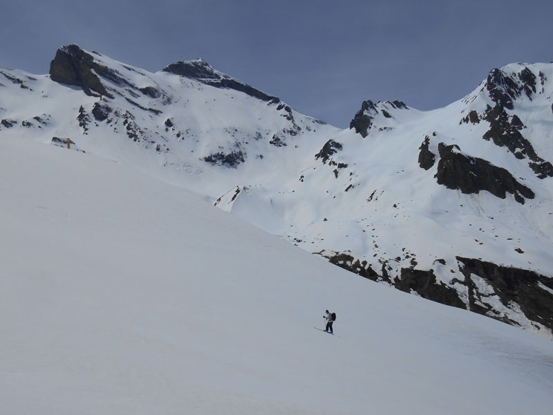 Je monte quelques dizaines de mètres sur la pente glacée du Soum des Salettes. Le pic ne peut se gravir qu'en crampons et piolet. Il nous manque le piolet. La descente jusqu'au col en dérapage est difficile.