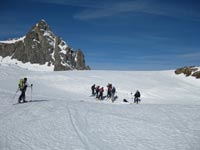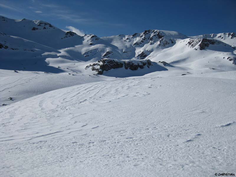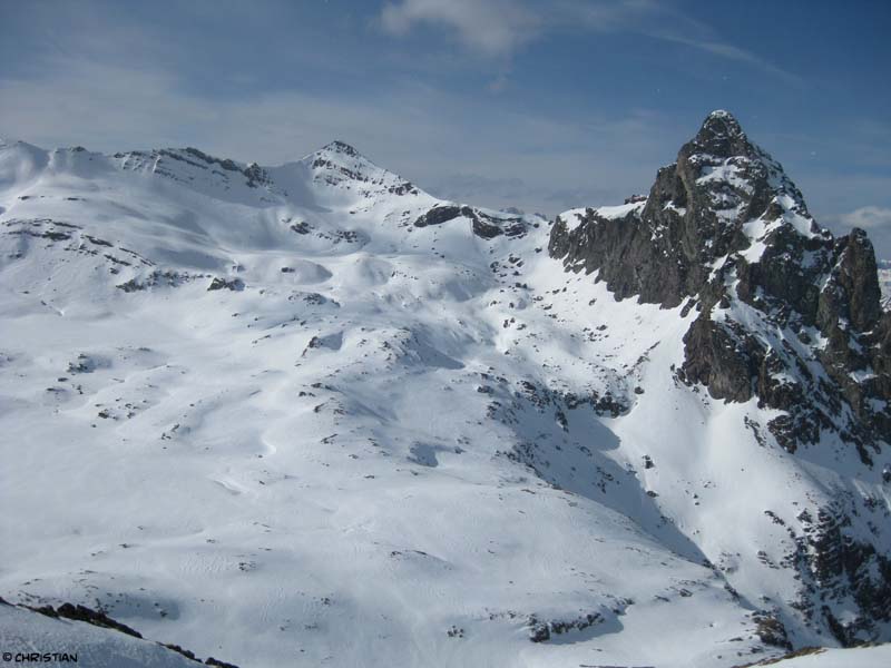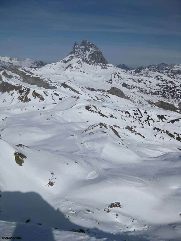 Nous sommes 13skieurs conduit par Jean sur les pistes glacées de la station de Formigal. Il est 9h20 et l’allure soutenue de la montée nous réchauffe rapidement. Dès que nous quittons la piste, nous entamons une longue traversée, plus ou moins en équilibre, dans cette neige des Ages de glace. Après avoir dépassé une pente givrée et raide nous parvenons sur le vaste vallon d’Anayet. Nous admirons, au sud-est les crêtes et cimes de la Culibillas, des Arroyeras, d’Anayet, plus au nord le majestueux pic du Midi d’Ossau, s’élève au-dessus d’Espelunciecha. Les couteaux s’avèrent nécessaires pour l’ascension du sommet.