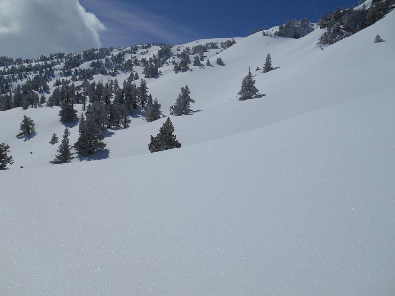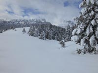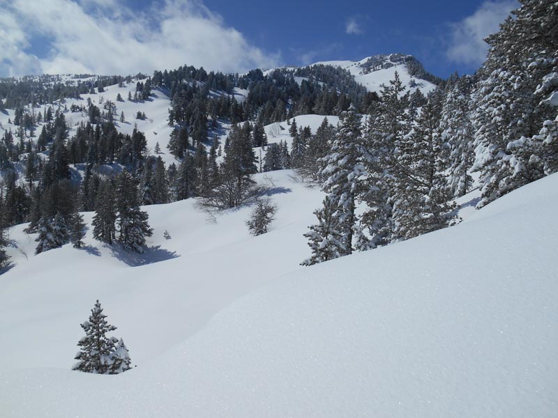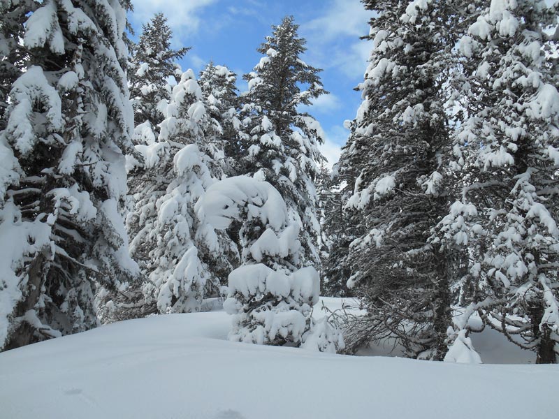 La route enneigée du col de Bouesou entraîne quelques frissons du fait de son étroitesse, au bord des ravins. Soulagés d'être encore entier, nous chaussons les skis à 8 h 45 et suivons un sentier dans la forêt d'Issaux.. La neige fraîche étale ses magnifiques guirlandes blanches, suspendues aux branches des sapins. Au sol, elle forme des milliers de petites billes blanches.