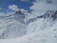 Tandis que nous déjeunons, 2 Gypaètes barbus, nous offrent un bal céleste dans un vol d'une haute élégance.À 13 h 20 nous plongeons dans les pentes. La neige est excellente pour le ski. Nous improvisons des figures, allant du classique à l'abstraction, mais c'est impressionniste !