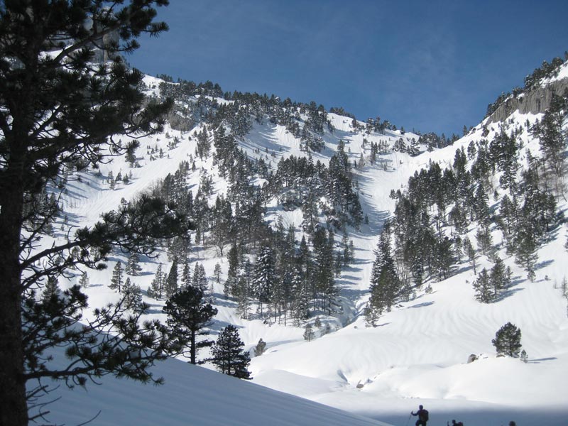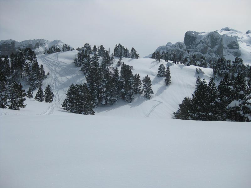 Nous marquons une courte pause ravitaillement, à la cabane d'Ichéus. La descente du bois est acrobatique et nous amène près de la cabane de Camplong, face au Pas de l'Osque. Nous remontons un large couloir redressé, menant à Barlagne. Le passage d'un mur de neige s'avère délicat. Les conversions sont très serrées. Le vallon de Barlagne se poursuit sur une crête, parsemée de sapins. L'endroit est féerique.