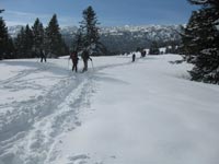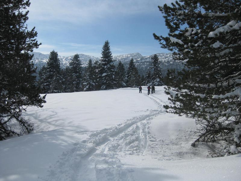 Nous démarrons, skis aux pieds, à travers la forêt d'Issaux, les champs, le bois de Girabé et de Catazar. Comme dans un immense cirque, bordé de cimes enneigées et vers le bas des champs de neige et des villages lointains, nous évoluons dans ces espaces magnifiques, décorés des sapins aux branches de satins blancs.