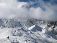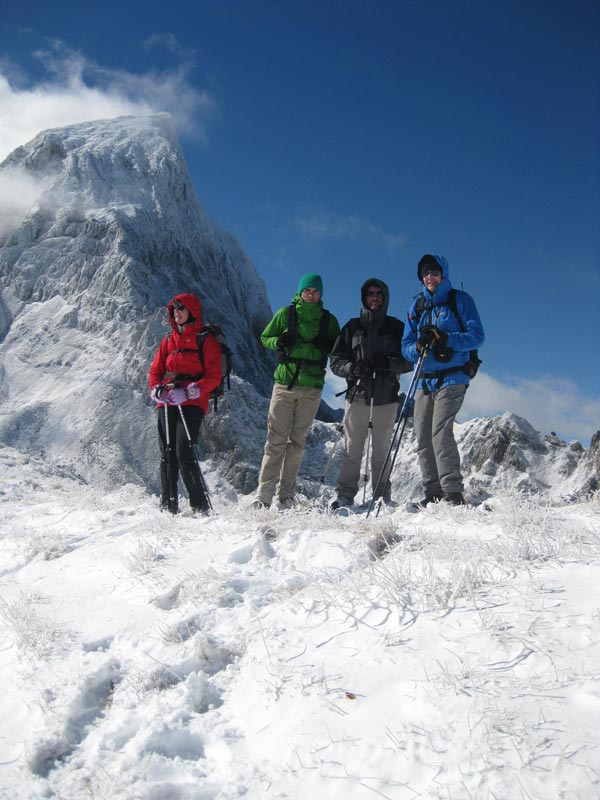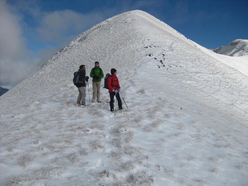 Le pic du Midi d’Ossau cache sa pointe dans les nuages. Ses flancs sont plâtrés par la neige. Des isards, impassibles, nous observent, intrigués. Lorsque nous arrivons au col de Magnabaigt, nous sommes accueillis par des rafales de vent. Nous longeons la crête de Chérue, jusqu’au pic de Chérue balayé par le vent violent. Poursuivre la crête de Lavigne Chérue expose à des risques, d’autant que les plaques de glace sont nombreuses. Il est 11h30.Nous sommes gelé et nous optons pour la descente.